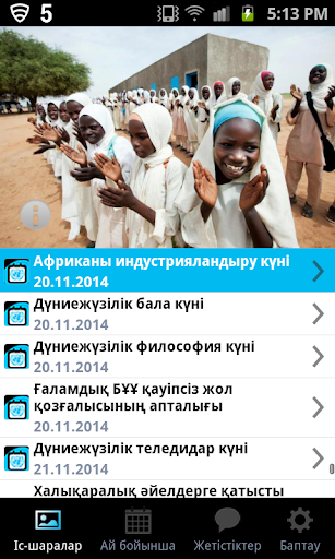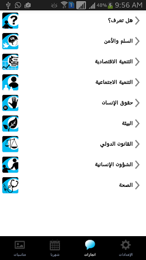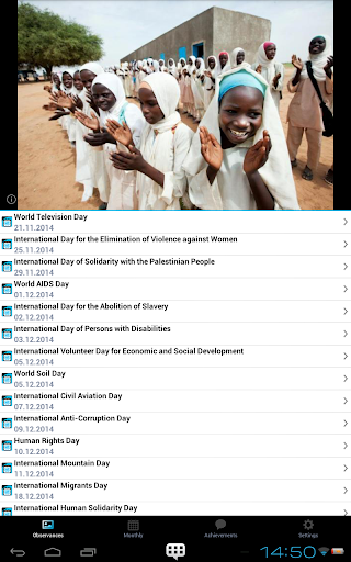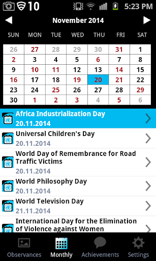 United Nations observances promote awareness of and action on important political, social, cultural, humanitarian or human rights issues. The free UN Calendar Android app provides details of UN observances, as well as ways to get involved in related events and links to obtain further information. It illustrates how the United Nations makes a difference in peace and security, economic development, social development, human rights, the environment, international law, humanitarian affairs and global health.