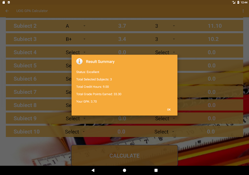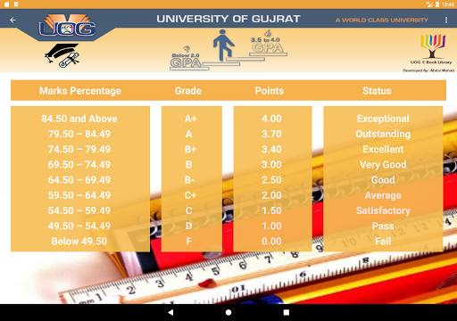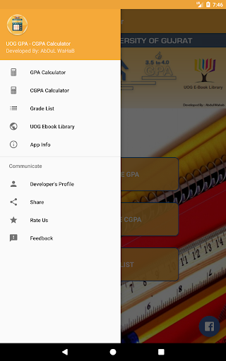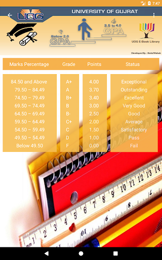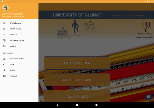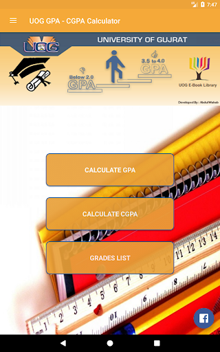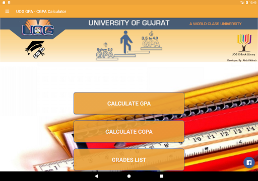 Uog GPA - CGPA Calculator - это бесплатное приложение для Android & Windows. Это приложение специально разработано для университета Гуджарата и их субъектов. Он позволяет пользователям Android рассчитать их GPA и CGPA в любое время в любом месте. Это приложение строго следует критериям расчета GPA и CGPA в соответствии с университетом Gujrat с удобным интерфейсом. Разработано Абдуль Вахаб