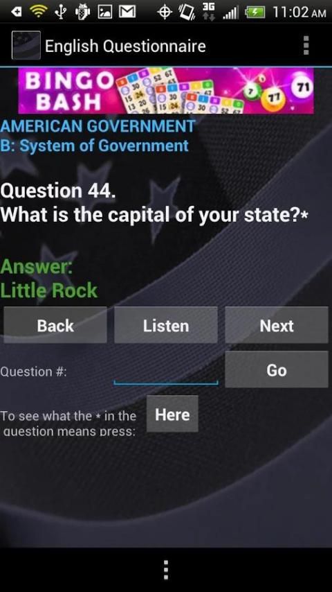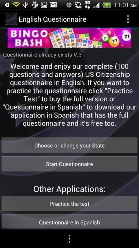This is the completed questionnaire in English (100 questions and answers) on civics (history and GOVERNMENT system) for the U.S. naturalization. - It has all the information on your specific state! - Only need to choose the state you live in and go! - This program can pronounce the questions and answers if you have installed text to speech application for Android that you can download from the Market (most of the android devices already comes with it.)! - You can go to the specific question you want! The first time you open the application may take a little longer to download all the necessary information! the next time will be faster! I hope you pass and good luck! Report any problems.
