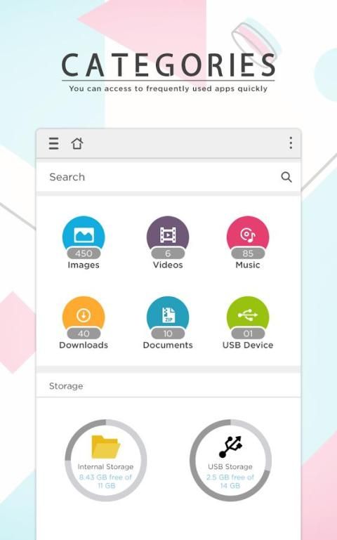 • значки быстрого доступа для вас SD карт, папки камеры, папки Bluetooth, Загрузка и музыка папка.
