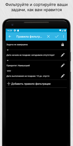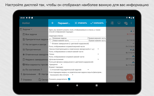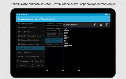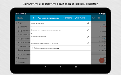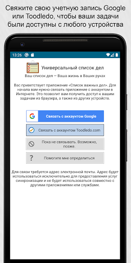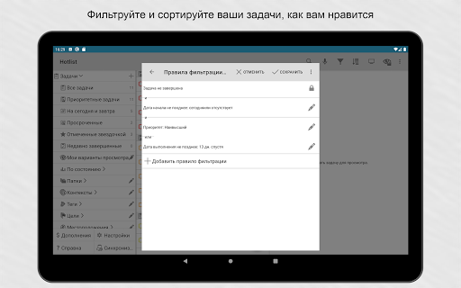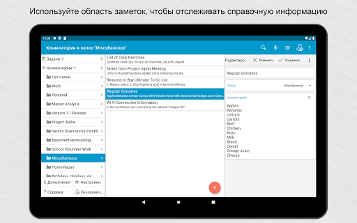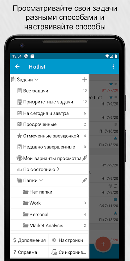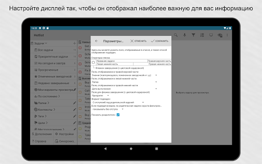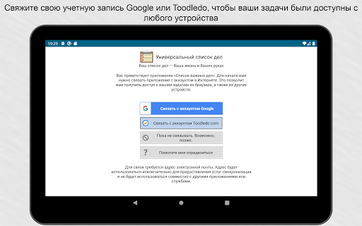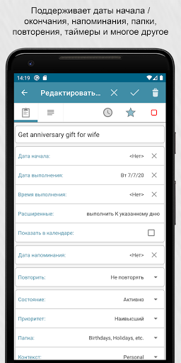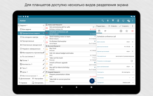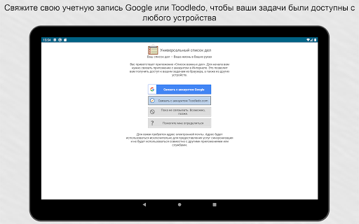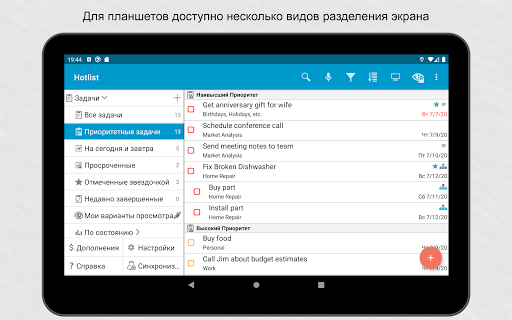 Возможности синхронизации.Свяжите приложение с аккаунтом Google или Toodledo.com для синхронизации устройств. Синхронизация может выполняться автоматически.