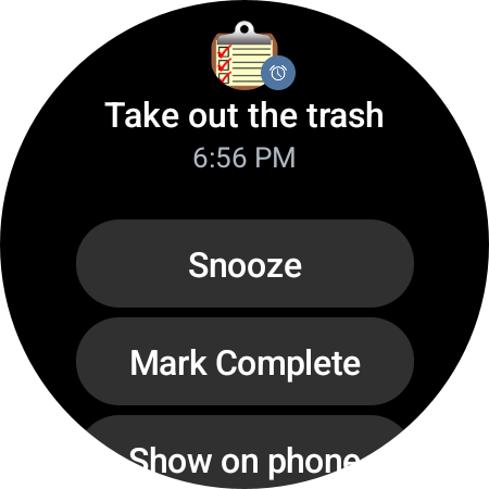 Работает с Wear OS. Надстройка для Wear OS позволяет просматривать задачи, делать отметки об их выполнении, а также просматривать и отключать напоминания. Напоминания о ваших задачах появляются в виде уведомлений на ваших часах в установленное вами время. Из уведомления вы можете отложить напоминание или пометить задачу как выполненную. (Все остальные функции, перечисленные здесь, предназначены только для телефонов и планшетов.)
