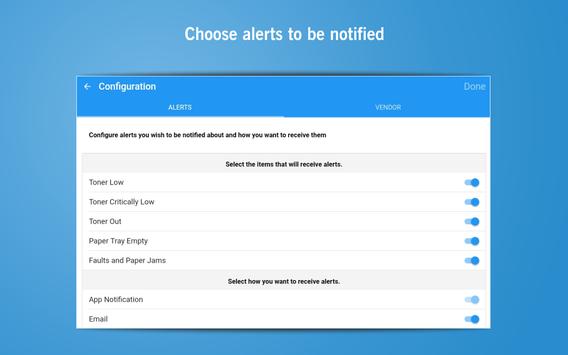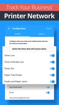 - Printer alerts can be configured within the printing app to identify the conditions that will cause an alert (toner/paper low, paper jams), and whether you want to enable active alerts via email and app notifications.