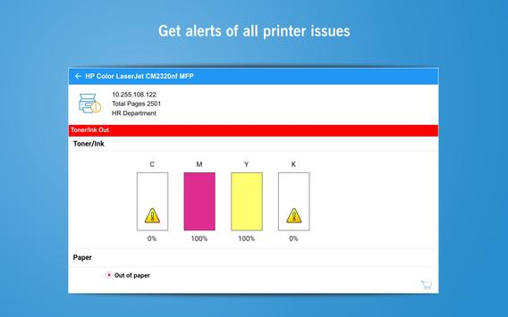 Monitor network printers from your mobile device with the free Universal Printing Assistant (UPA). Check printer alert conditions and operating statuses with a tap, whether it’s a low/empty paper tray, low toner/ink or a paper jam. Get printer notifications automatically via email and/or notifications if a printer enters an alert state.