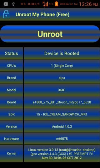 Просто нажмите на кнопку "выкорчевывать" и приложение будет заботиться об остальном. После завершения процесса устройство перезагрузится автоматически. Этот процесс является ПОСТОЯННОЙ - не могут быть отменены.