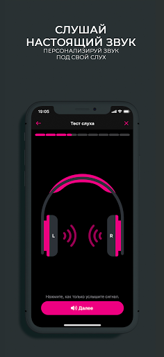 – Протестируйте свой слух: получите высокое качество звука, идеально приспособленного под ваши слуховые особенности.