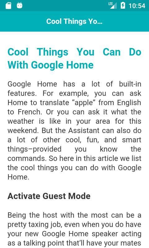 Есть так много вещей, которые добавлены в этом приложении, как прохладные вещи, которые вы можете сделать с Google домом, наиболее полезными голосовыми команды, советы и хитрость. Установите приложение, учиться и делать больше с Google Home.