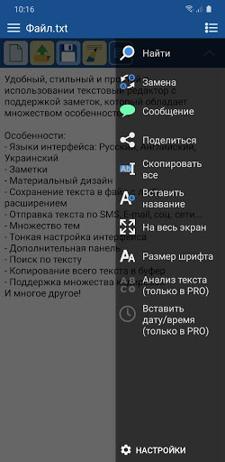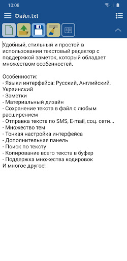 С помощью этого текстового редактора вы можете просматривать и редактировать содержимое файлов. Также, имеется возможность сохранения текста как заметки для её последующего просмотра и редактирования в данном приложении.