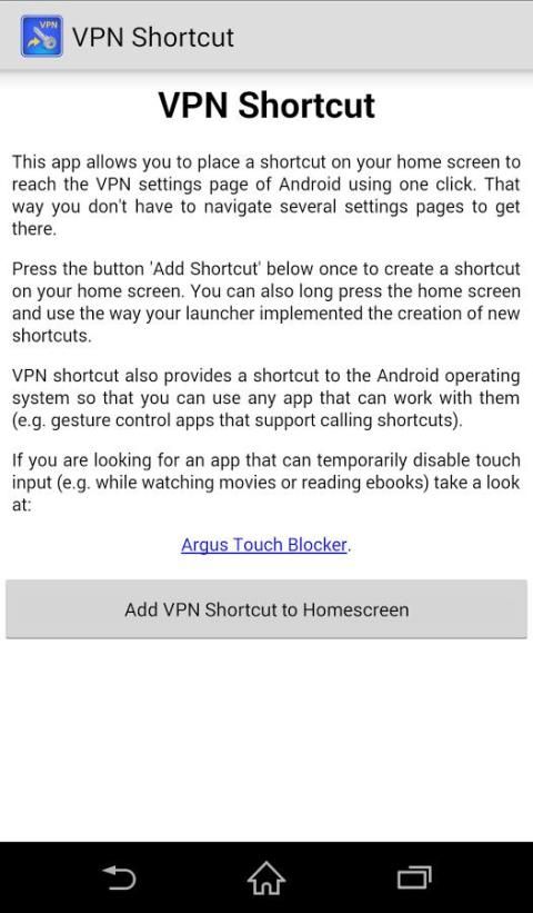 VNC Ярлык имеет только одну цель - обеспечить вас с ярлыка (либо непосредственно на главном экране или третьим лицам приложение, которое можно использовать ярлыки, как некоторых контрольных жест приложений), который приносит вам к VPN страница настроек с помощью одного щелчка мыши.