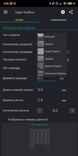 - выбор спирали между микрокоилом(microcoil) и клэптоном(clapton), fused clapton и spaced clapton
