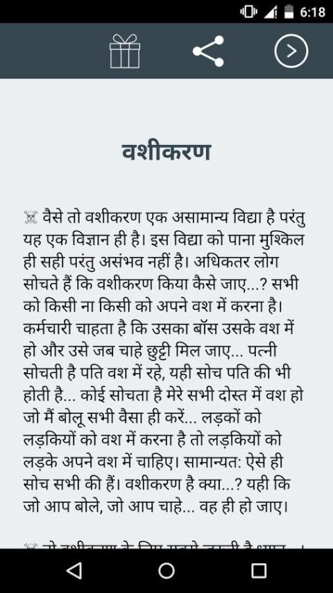 Его также известный как Махила vashikaran. Это приложение полезно управлять своей женой, мужем, детьми, подругу или любовника, влияя на их и сделать их, как вы и выполнить ваше желание. Если кто-то хочет, чтобы их любовь тогда использовать мантру и гипнотизировать своего возлюбленного или подругу. Если вы хотите прочитать другой ум затем использовать Vashikaran волшебное приложение. Мы гарантируем, что все решить их проблему и загипнотизировать другом, используя мантру дают в Vashikaran Магии приложения.