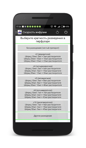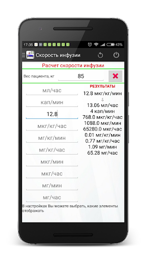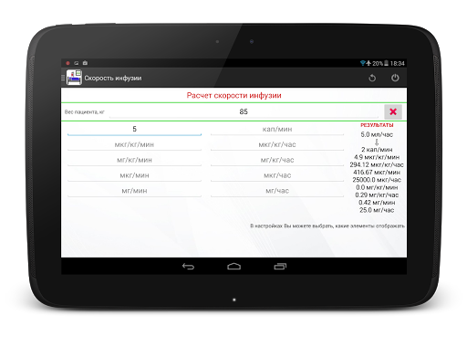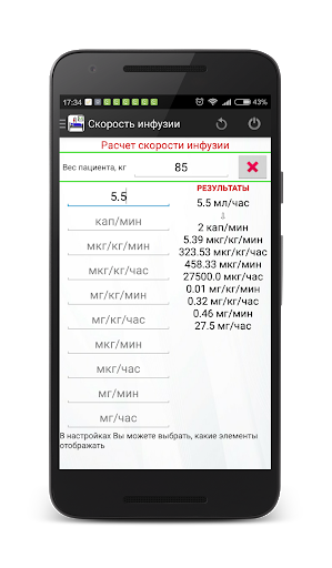 Программа позволяет рассчитать скорость парентерального введения препараторов через перфузор с учетом веса пациента и различных вариантов разведения раствора. Перевод из мл/час в мг/мин, мг/кг/мин, мг/кг/час, мг/час, мкг/мин, мкг/кг/мин, мкг/кг/час, мкг/час происходит быстро, просто и в минимальное количество касаний экрана. В настройках Вы можете выбрать килограммы или фунты.