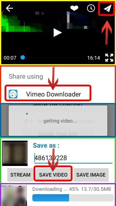 Перейти Vimeo приложение, и поиск видео вы хотите скачать нажмите на него и ударил треугольный значок "долю" в видео, как. в обмене варианты выбрать Vimeo Downloader и ждать загрузки с моего приложения, при загрузке отделку можно сохранить видео непосредственно, а также вы можете поделиться им с друзьями. Это оно!