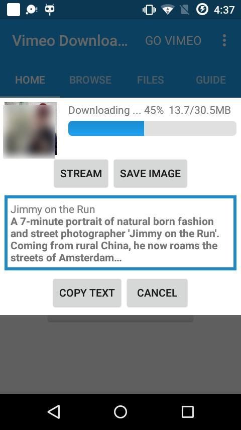 Vimeo видео-загрузчик является приложением, которое поможет пользователям сохранять видео с Vimeo, как формат MP4 для хранения телефона, и возможность копирования описание видео.