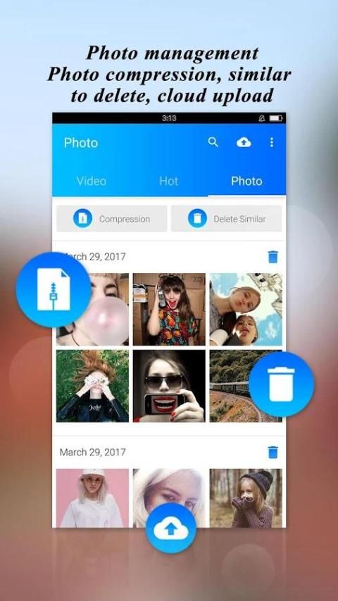 ● сжатие Фото и удаление подобных фотографий, экономя мобильное пространство.