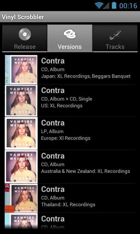 Винил Scrobbler позволяет производить поиск по отличную Discogs базу данных либо введя имя исполнителя или записи, или путем сканирования штрих-кода на рукаве или случае, предполагая, что релиз достаточно новый, чтобы есть. Если вы вошли в систему чтобы Last.fm На экране параметров можно передать треки вы просто слушали. С винила Scrobbler, когда запись, сторона, или даже трек закончил играть, вы можете забрать свой телефон, сканировать рукав, нажмите пару кнопок, и вуаля, дорожки появятся на вашем Last.fm профиля.