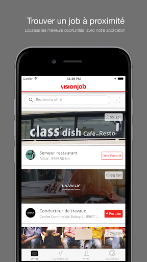 VisionJob - это приложение для примирения рекрутеров.Рекрутеры вкладывают свои объявления и предложения о работе, которые автоматически отправляются на смартфоны с удовлетворительными кандидатами поиска критериев поиска.Они могут напрямую увидеть доступные кандидаты, Geo Localized.