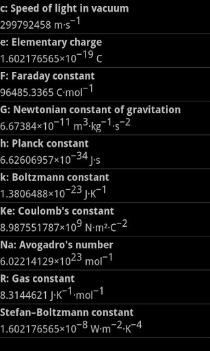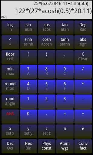 One of the most complete scientific calculator in the android Market with a built in database of conversion factors, atomic weight and physical constants. Functionalities: Standard operations: ,,,Trigonometric Functions: sin,cos,tan,asin,acos,atanHyperbolic functions: sinh,cosh,tanh,asinh,acosh,atanhDegree and Radians modeNatural and Base 10 logarithm: log, ln, exPower Functions: x2,yxExponential NotationAbs,Sign,Floor,Ceil,Round,Min,Max, and Random NumberX,Y,Z easy to set variablesBase conversion HEX,DEC,OCT,BINAtomic weight databasePhysical Constants databaseOver 200 conversion factors Area,Bytes,Density,Energy,Force,Length,Mass,Power,Pressure,Speed,Volume