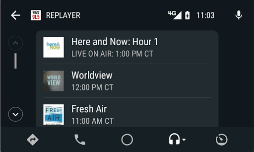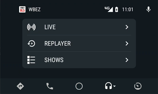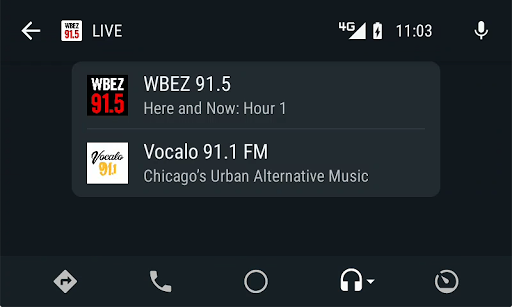 WBEZ now supports Android Auto. You can stream WBEZ 91.5 or Vocalo 91.1, replay shows you missed, and play podcasts from supported Android Auto in-car dashboards or from the Android Auto app.