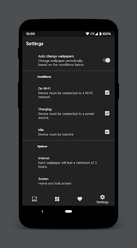 Walpy не полагается на тревоги с фиксированным временем, которые не позволяют вашему устройству получить достаточный сон.Это позволяет Android выяснить, когда лучше всего изменить обои.Вы можете настроить ограничения только для изменения обоев, пока ваше устройство: