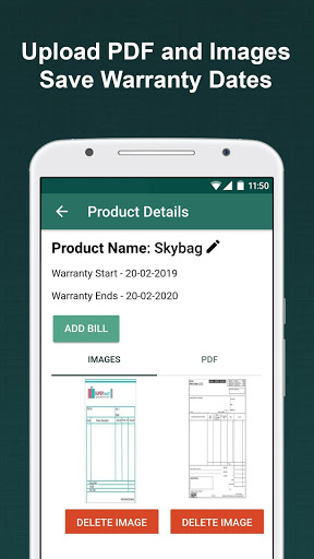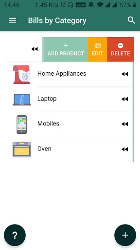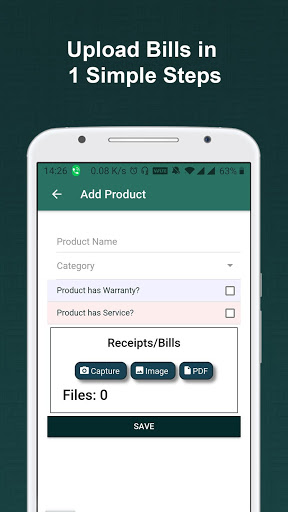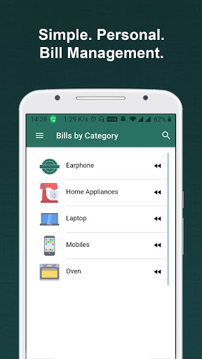 Вы можете управлять своими счетами / квитанциями в одном месте. В настоящее время приложение имеет 6 категорий продуктов, а именно, телевидение (телевизор), мобильный, холодильник, стиральную машину, ноутбук и компьютер. Вы также можете создать свои пользовательские категории для продуктов.