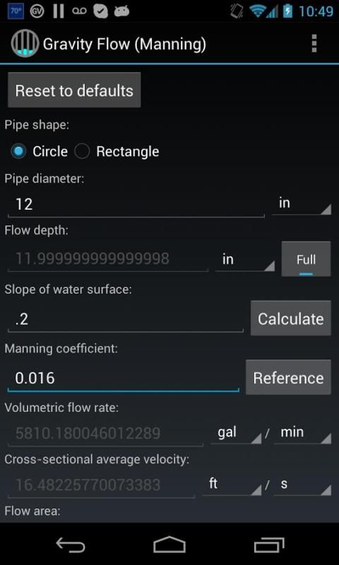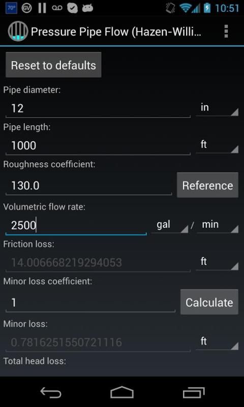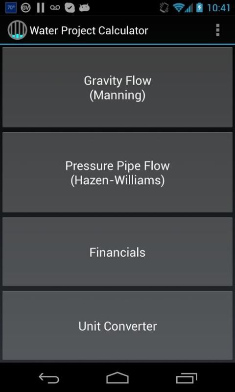 Калькулятор водный проект был разработан инженерами занятий водными чтобы помочь решить проблемы с которыми они сталкиваются каждый день. Хотя это в первую очередь предназначен для резервного оф-конверт расчеты, это так просто, что вы можете найти себе использовать его в передней части компьютера, как хорошо! Каждый экран состоит из списка параметров в одной системе уравнений. Введите все известные данные, и приложение будет немедленно решить для остальных.