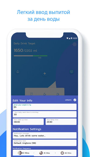 Наш трекер баланса воды в организме мотивирует пить воду по расписанию. Также, счетчик воды позволит вам вести дневник потребления воды, указывать время питья воды, и количество воды, которое вы пьете. И даже если вы забудете выпить воду, напоминалка отправит вам напоминание выпить воды.