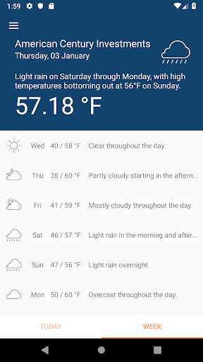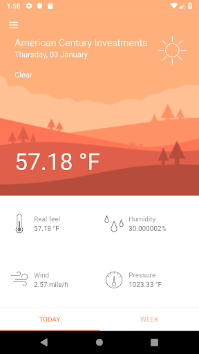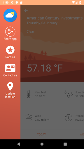 With this weather app you can get daily forecasts as long as weather prediction and prognoses. Two tabs demonstrate such information as atmosperic pressure, temperature, real feel temperature and other parameters. Also in separate tab detailed infomative forecast for week is given.