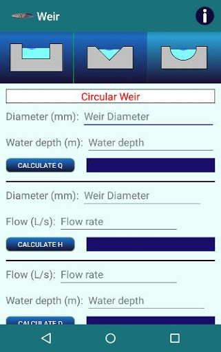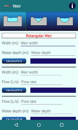This app calculates the flow rate, the water depth and the dimensions of retangular, triangular and circular weirs.