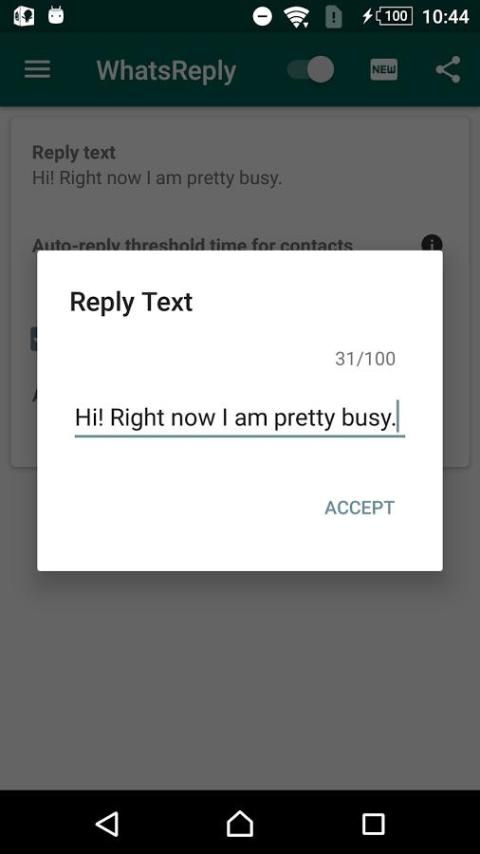 WhatsReply для WhatsApp это бесплатное приложение, которое автоматически реагирует на сообщения, полученные в WhatsApp Messenger, доступны для Android. WhatsReply так же, как WhatsApp использует подключение к Интернету (4G / 3G / 2G / EDGE или Wi-Fi, если это возможно) на мобильном телефоне. Приложение автоматически отвечает вашим друзьям и семье, когда вы заняты. WhatsApp не включает в себя автоматический ответ для текстовых сообщений, но благодаря WhatsReply, ваш смартфон автоматически отвечает от имени вас к вашему WhatsApp контактов.