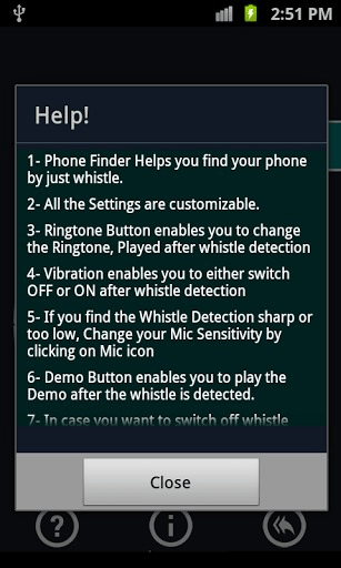 The Whistle Phone Finder is a best App to find your misplaced, forgotten, lost phone. Do you often forget where your phone is?? Do often your children misplace your phone?? You forgot your phone and you are in hurry?? Do often you forgets your phone in dark?? Then here is the solution. Whistle Phone Finder has helped many people to detect their with just a simple Whistle. If you don't know where your phone is, Just whistle and your phone will automatically ring to tell you that where it is. Here are some of the features of Whistle Phone Finder app. -- Locate Your Phone with a simple Whistle. -- Customizable Settings to run after whistle is detected on Phone. -- Play the Demo of All settings. -- Default Settings are Play Ringtone and Vibrate. -- Change the Mic Sensitivity. -- Switch On / Off the Whistle Phone Detection. -- Switch On / OFF Flash. Please Help us in improving this app by giving a good review. The Bugs you Report through our email are always welcome. Note: In order to offer this app completely free, we have included some Adds. Thanks.