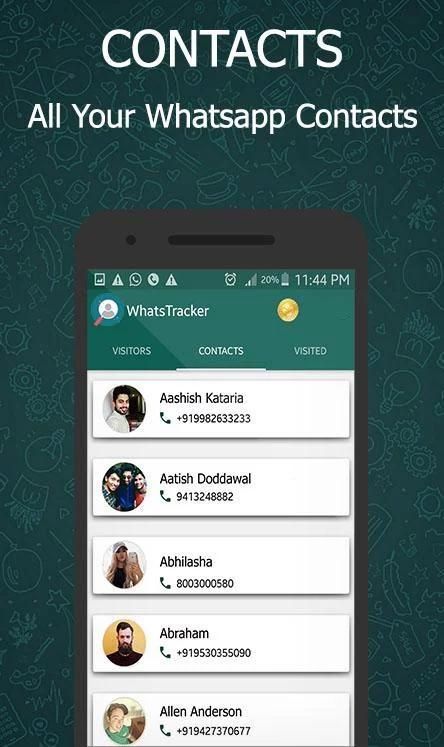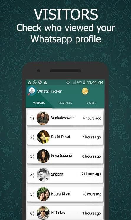WhatsApp Tracker дает вам список людей, которые посетили ваш профиль. Вы можете также отслеживать время их визита. Достаточные монеты необходимы для просмотра данных. Зная, кто посетил ваш статус или профиль WhatsApp рис поможет вам определить, кто те люди, которые следует за вами, или кто твой тайный поклонник, доброжелатель или профиль сталкер.