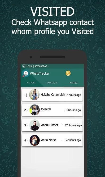 Заказ людей, которых профиль, который вы посетили в последнее время в последние несколько дней. Это означает, что вы либо читать их WhatsApp статуса или посетили их профайл. Это означает, что вы посетили их. Таким образом, всякий раз, когда вы посещаете чью-WhatsApp статуса или профайл, соответствующее лицо идентифицируется тем же, если он / она использует WhatsApp Tracker.