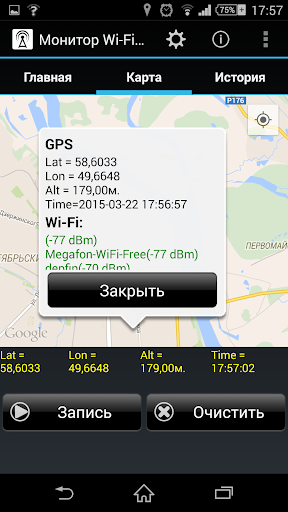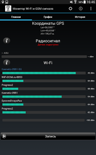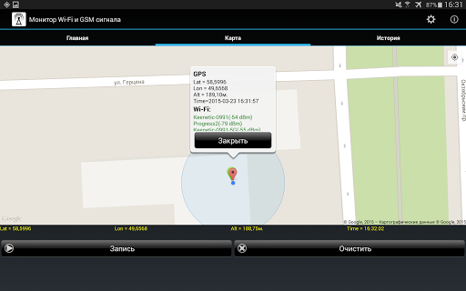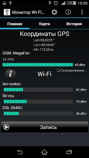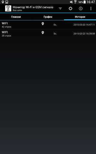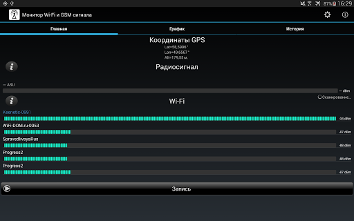 Монитор Wi-Fi и GSM сигнала позволяет отслеживать уровнь сигнала в GSM и Wi-Fi сетях. Приложение строит графики уровня сигнала, а также отображает данные с привязкой к координатам на картах Google Maps.