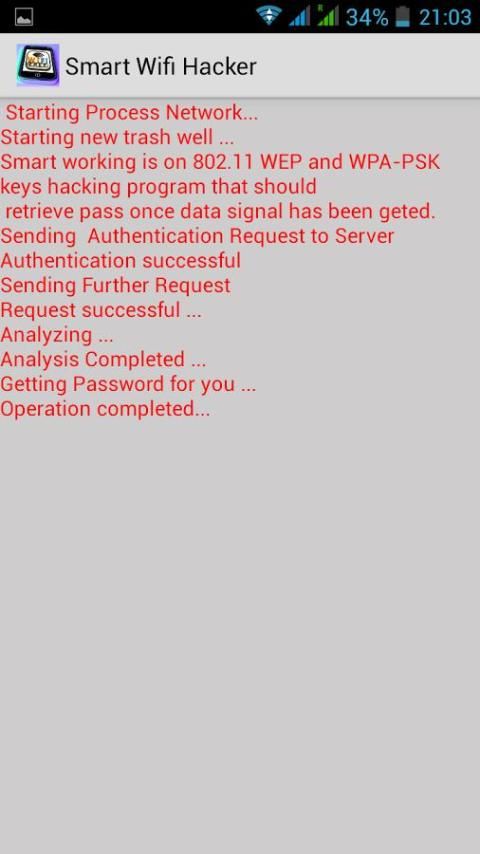 WiFi Hack розыгрыши Pro позволяет подключаться к любой беспроводной сети в пределах диапазона, и все это занимает пару clicks.Just запустить это приложение в своем доме и выбрать их имя беспроводной сети. Поддельные пароль будет отображаться, но они будут думать, что вы просто сломаны в их сети! WIFI Hacker розыгрыши является шуткой приложение. Он только делает вид, что взлом защищенной сети Wi-Fi.