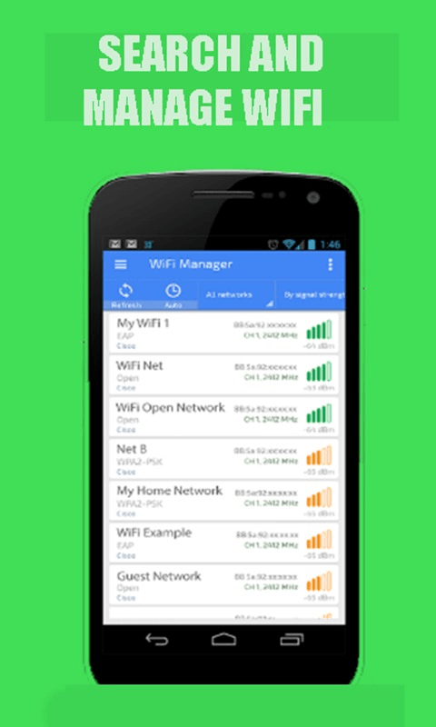 "WiFi Manager Analyzer free" helps you find the best access point to the wifi connection. Gives you information about each automatic access to a wifi connection channel Available wifi easy connection for internet connection. - You improve internet speed for better speed. - Wifi finder fast internet connection - Display saved wifi password. - using static IP parameters. Automatic switching between the different APs. - download speed value Show download signal in the graphic of the story. - find, connect, manage wifi networks. - class & resistance Search WIFI Signal. - easy switching between the best free wifi extender. - Address Display the MAC and IP address of the access point. - WPS support for Android 4.0 or above devices. And Tablet support. - Available any language like English, Spanish, Italian, Russian, French, Portuguese, etc. WIFI analyzer will give you useful information about the wireless signal around you. Increase signal strength using WIFI backup to get better better Hotspot wireless signals for high download and download your internet speed. Features of WiFi Manager Analyzer free: * Manage your WIFI connections * Find, connect and manage WiFi networks around you. * Find the best WiFi networks. * Monitor Connections * Measure the strength of your WiFi signal. * Useful information about your phone. * Useful computer network. * Useful communication tools. WiFi Manager Analyzer free is a free application for Android that can help you find, manage your networks WiFi connections around you. This application you can also overpreserve WiFi connections, find The best channels, verify the connection information and use the connection verification tools. Please note that this application is not a hacker password wifi. Only tools for Finder show you the available networks if any. It does not make the connection to a secure network. It supports open networks only in your area. WIFI Connection "