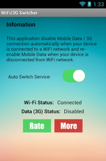 Wifi/3G Switcher is very simple, useful, lightweight application. - Allows you to extend battery life. - Reduce mobile data usage. This application disable Mobile Data / 3G connection automatically when your device is connected to a WiFi network and re-enable Mobile Data when your device is disconnected from WiFi network. This application using IOS7 theme. Try and experience!