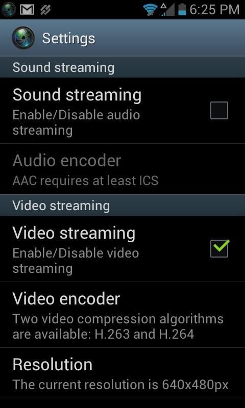 - Два видеокодеры доступны для Потоковое видео: H.263 и H.264