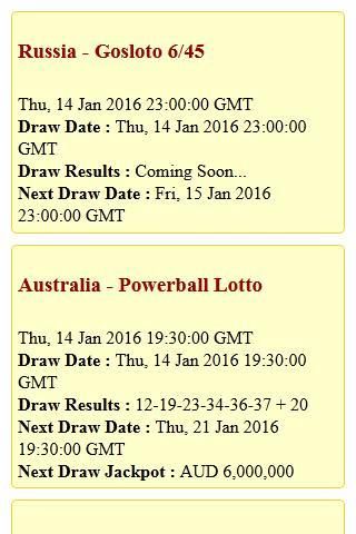 Австралия - Лото Powerball, Флорида - Лото, Нью-Йорк - Лото США - Powerball, Великобритания - Шаровая молния, Испания - BonoLoto, Австралия - Лото Среды и лотереи многих других популярных в мире в то же приложение!
