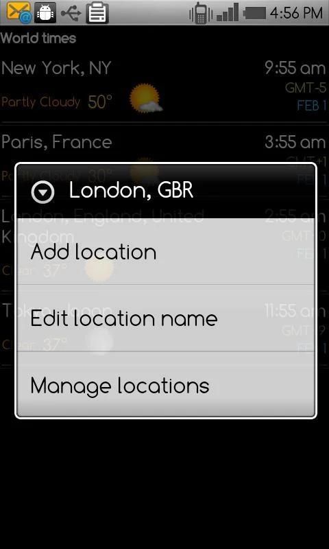 A full featured, world clock and weather widget available in 4x1 and 4x2 sizes A full featured, world clock widget available in 4x1 and 4x2 sizes. The widget supports an unlimited number of locations and will display local times, current weather conditions and weather forecast. The widget features the following: - 7 different skins to chose from (more skins coming in the future) - 4 weather icon skins - Works in portrait or landscape mode - 12 or 24 hour clock with date - Detailed weather forecast display including the following: - Local time - Sunrise and sunset time for current location - Humidity and wind conditions - Current condition, temperature and low and high temperatures - Current condition icon - Last weather update time - 4 day weather forecast - Unlimited number of locations; enter all your favorite locations and easily keep track of the current time and weather conditions The widget can be fully customized with the following options: - Chose the widget and weather icon skins - Chose the text color for the time, am/pm indication, date, location, current weather condition and current temperature - Display 12 or 24 hour time with optional AM/PM indicator (if 12 hour format) - Beep every hour (optional) - Select the date display format - Optionally show or hide specific elements of the widget (weather icon, date) - Display temperature values in Celsius or Fahrenheit - Select automatic weather refresh period (15 minutes, 30 minutes, 1, 2, 3, 4 or 6 hours) - Enter your favorite world locations to watch local times, current weather conditions and weather forecast information - Update weather on WiFi and/or GPRS - Chose whether you want to update while roaming or not - Play notification sounds on location and weather changes and updates - Select alternate weather forecast service (MSN) - default is Google IMPORTANT!!! - This is a widget, not an application. To install it please refer to the help display when you run it. There is also a link to a video that shows you how to install it. - If you are using a task killer exclude the widget from it Please report any problems, suggestions or requests via e-mail at xdroid27@gmail.com.