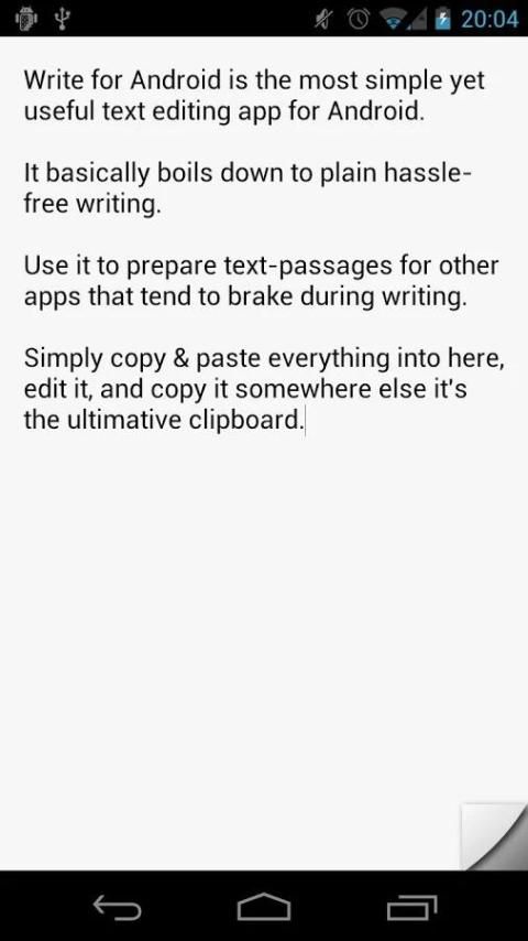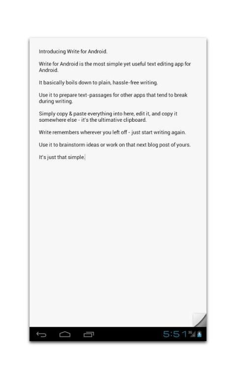 Написать для магазинов Android все ваши писания безопасно и запоминает последнюю позицию вы перестали писать. Вы можете просто начать все сначала, где вы остановились при открытии приложения в следующий раз.