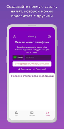 • Создайте свою собственную WhatsApp ссылку через WtsAppy и поделитесь ей с тем, с кем Вы хотите связаться по WhatsApp, и Вы сделаете это в один клик вместо обмена номером и сохранения контакта. WhatsApp ссылка необходима, особенно если Вы заняты в бизнесе, и теперь Вы можете получить ее за 10 секунд с помощью WtsAppy!