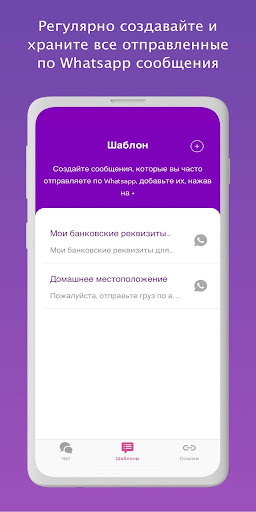 • Сохраняйте шаблоны сообщений, которые вы часто отправляете по WhatsApp. Сохраняйте их в Wtsappy как заметки, которые можно перенести на WhatsApp в любое время одним кликом. Да, только одним кликом! Шаблоны могут содержать Ваш почтовый адрес, Ваше местоположение или Ваш банковский счет.