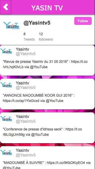 Yasintv является сенегальский веб-портал, который предоставляет новости и горячие непрерывно. Кроме yasintv является предложение серии WebTV, JT ток-шоу. Короче yasintv предлагает новый опыт веб 2.0. Скажем, у меня знак Ясина.