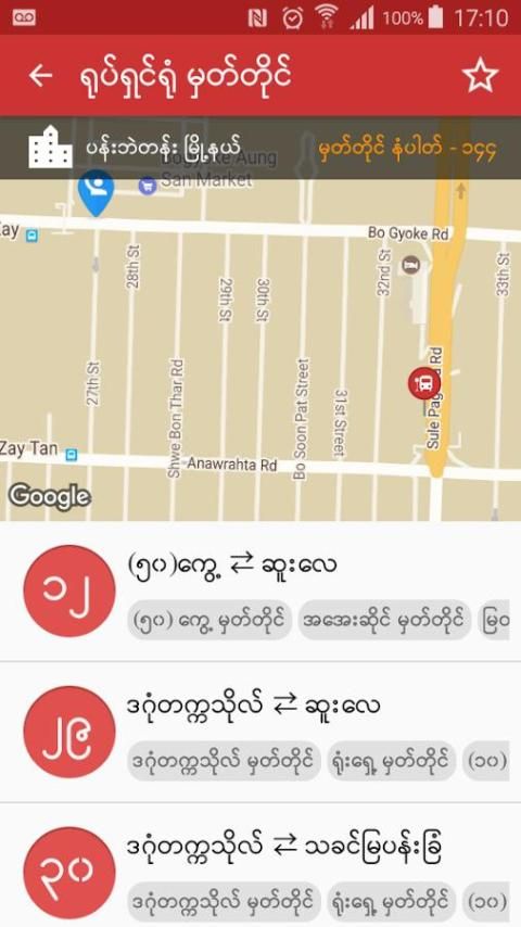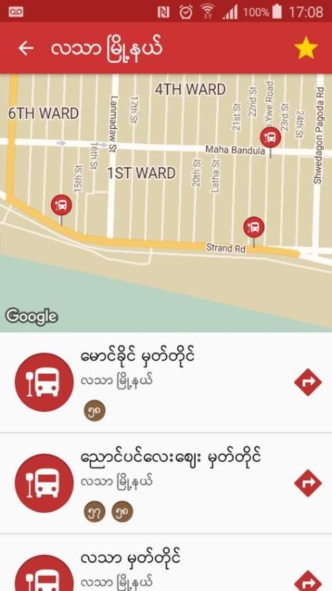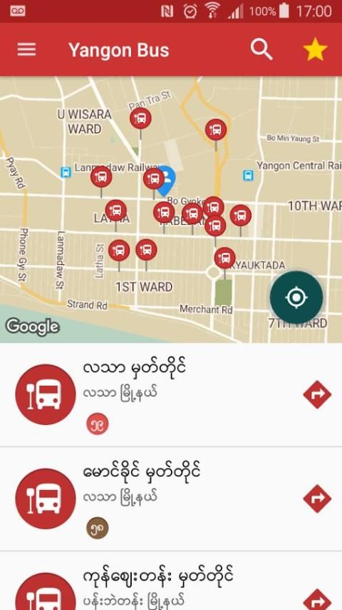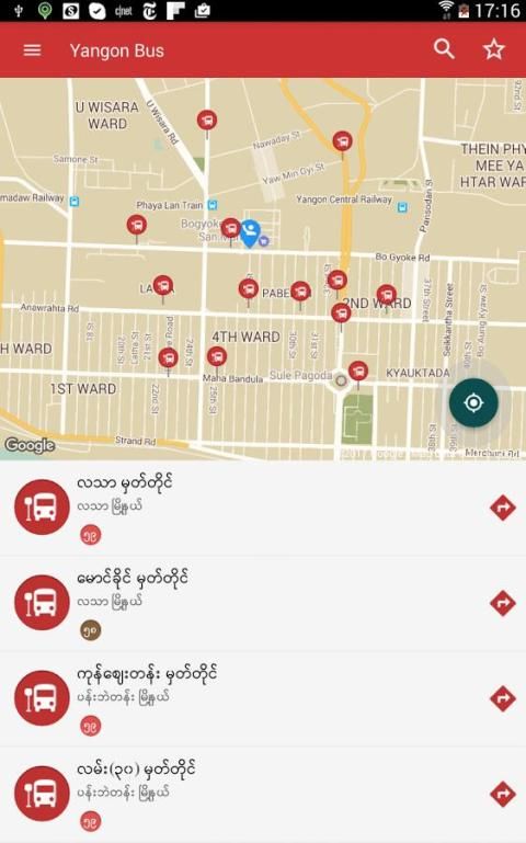 - Отображение информации автобусной остановки в пределах заданной длины от вашего текущего местоположения с помощью услуги определения местоположения. Когда услуга определения местоположения выключено, приложение используется расположение по умолчанию центра города Янгон.
