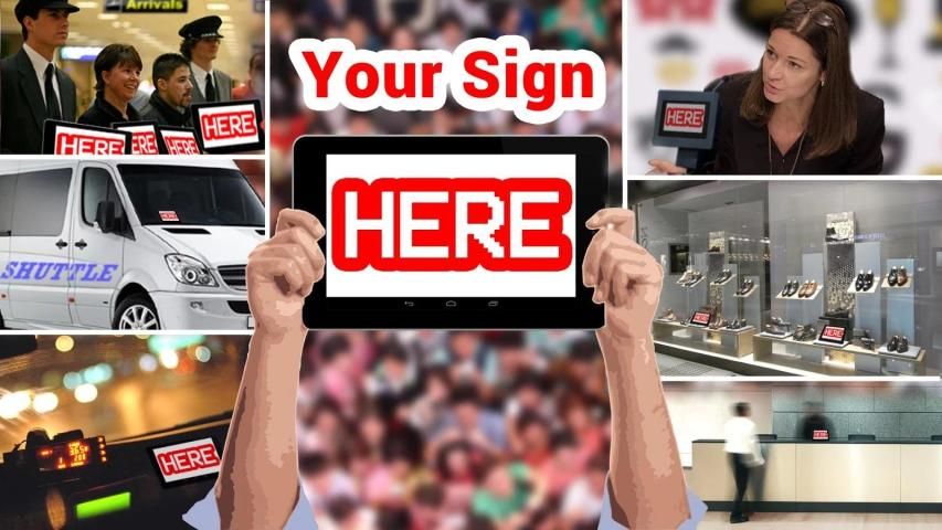 Ваш знак здесь может быть использовано, чтобы кто-то в аэропорту, на пресс-конференции, в стойке регистрации отеля, в окне магазина или просто для удовольствия.