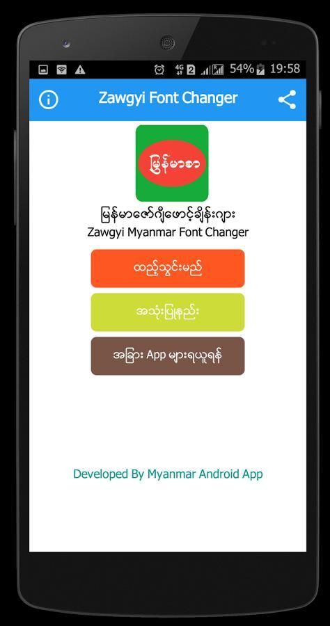 9Apps is the free store of application, 20,000+ users downloaded Zawgyi Font Changer latest version on 9Apps for free every week! Fortunately, It's easy to get this popular app. This hot app was released on 2017-07-20. To read more information, you can go to 9Apps.