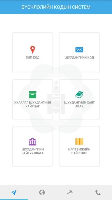 Монгол улсын бүсчлэлийн кодын нэгдсэн мэдээллийг авах, Хэрэглэгч өөрийн байгаа байрлалтай ойр шуудангийн байгууллагуудын байршил болон бусад холбогдох мэдээллүүдийг авах, Шуудангийн нэгдсэн код авах хүсэлт гаргах, илгээмжийн байршлын мэдээллийг тодорхойлох, Монгол улсад мөрдөгдөж буй шуудангийн үйлчилгээтэй холбоотой хууль, дүрэм, журмуудыг нэг доороос авах, Шуудангийн салбарын талаарх сүүлийн үеийн мэдээ, мэдээлэл, Монгол улсад шуудангийн үйлчилгээ эрхэлж буй байгууллагуудын талаарх мэдээллүүдийг авах