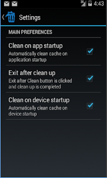 1.One click to clear all cached files 2. You can set auto clear when you open this app in settings page 3.Clean when device startup 4.list applications by either cache size or app name 5.Clean cache for particular application also