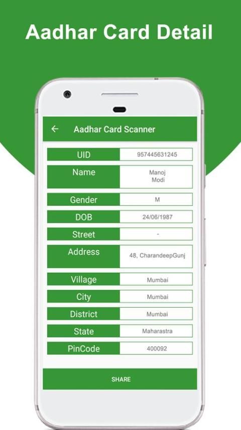 • Вы получите все детали, пока вы отсканировать Aadhar карты, детали, которые будут получать после сканирования QR-код карты Aadhar. (Имя, Пол, дата рождения, UID, уход, Village Техсиле, почтовое отделение , район, государство, PIN-код (почтовый индекс)).
